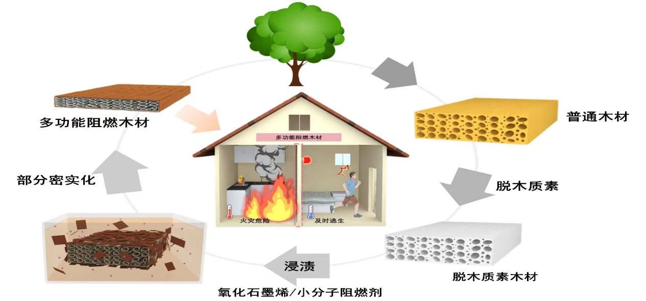 該團隊利用木材天然的多尺度孔隙結構,制備出一種擁有高效阻燃性能、優異力學性能和智能火災響應性能的多功能木質基材料。該技術顯著提高了木材的利用價值,拓展了木材的應用領域,同時實現了木材“小材大用”和“劣材優用”的目標,有利于減少環境污染,完美詮釋了綠色的生產生活和可持續發展的生態理念。