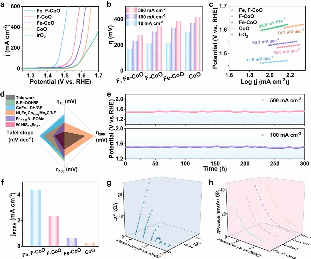 基于此,胡勇教授課題組通過簡單的陰、陽離子雙摻雜策略制備了Fe和F共摻雜的粗糙CoO納米針陣列(縮寫為Fe、F-CoO NNAs)用于堿性條件下的電催化析氧反應(yīng)。得益于晶格氧活化和局域電場的耦合作用,所制備的Fe、F-CoO NNAs在10 mA cm–2的電流密度下表現(xiàn)出169 mV的極低過電位,在500 mA cm–2的工業(yè)電流密度下表現(xiàn)出277 mV的過電位和優(yōu)異的耐久性,超過了大多數(shù)已報導(dǎo)的OER催化劑。