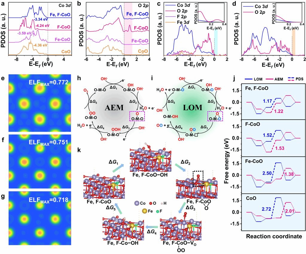 進(jìn)一步結(jié)合實(shí)驗(yàn)結(jié)果和理論模擬發(fā)現(xiàn)Fe和F雙摻雜可協(xié)同調(diào)節(jié)CoO的電子結(jié)構(gòu),改善金屬-氧共價性和促進(jìn)晶格氧活化,激活LOM機(jī)制。此外,F(xiàn)e摻雜增強(qiáng)尖端電場和鄰近效應(yīng),在催化劑表面高效富集OH?,提高了傳質(zhì)動力學(xué),優(yōu)化了LOM反應(yīng)能壘,促進(jìn)了O2的解吸。這些結(jié)果為設(shè)計高效的OER電催化劑開辟了一條新途徑,也加深了對催化劑構(gòu)效關(guān)系和電催化機(jī)理的理解。更廣泛地說,這項(xiàng)工作對其他催化反應(yīng)以及涉及氧化學(xué)或傳質(zhì)的能量存儲系統(tǒng)的研究具有重要借鑒意義。