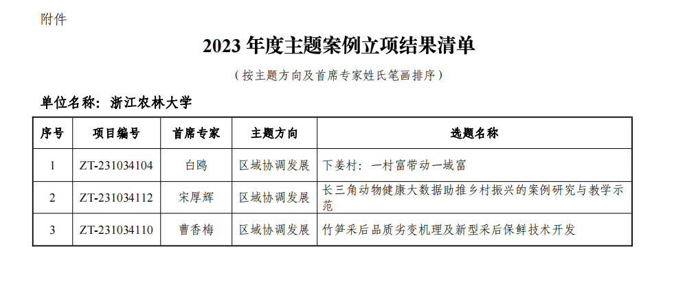 我校入選的3項案例分別是園林學院白鷗教授為首席專家的《下姜村:一村富帶動一域富》;動科動醫學院宋厚輝教授為首席專家的《長三角動物健康大數據助推鄉村振興的案例研究與教學示范》;竹子研究院曹香梅副教授為首席專家的《竹筍采后品質劣變機理及新型采后保鮮技術開發》。