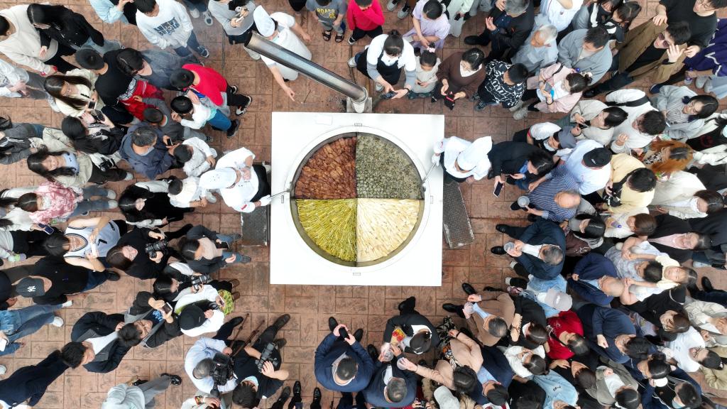 朱斌、胡祖吉、單軍及省餐飲協(xié)會會長沈堅為“農(nóng)林第一鍋”揭鍋。