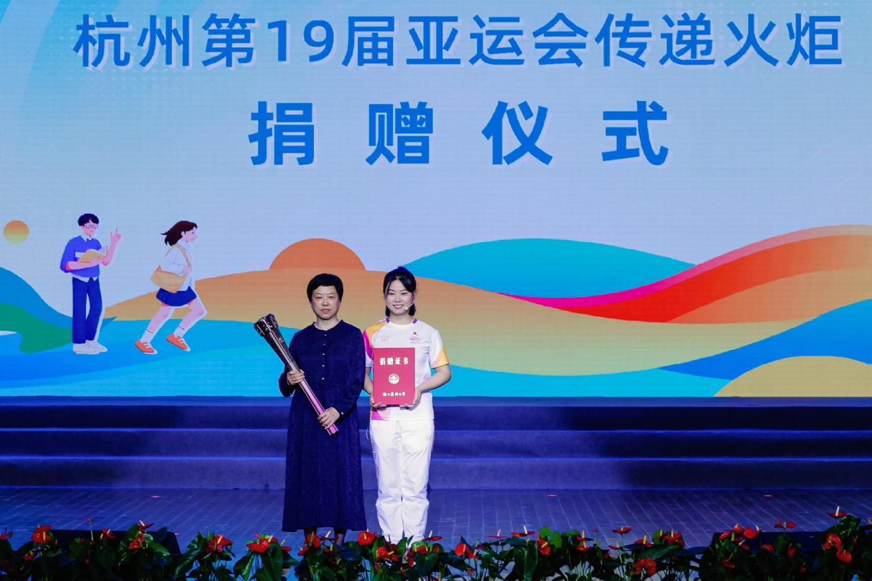 活動現場舉行了杭州第19屆亞運會火炬捐贈儀式。杭州亞運會火炬傳遞麗水站第165棒火炬手、我校城鄉規劃專業2020級學生吳素青捐贈亞運火炬。校黨委副書記施美紅代表學校接受捐贈,并為吳素青頒發捐贈證書。