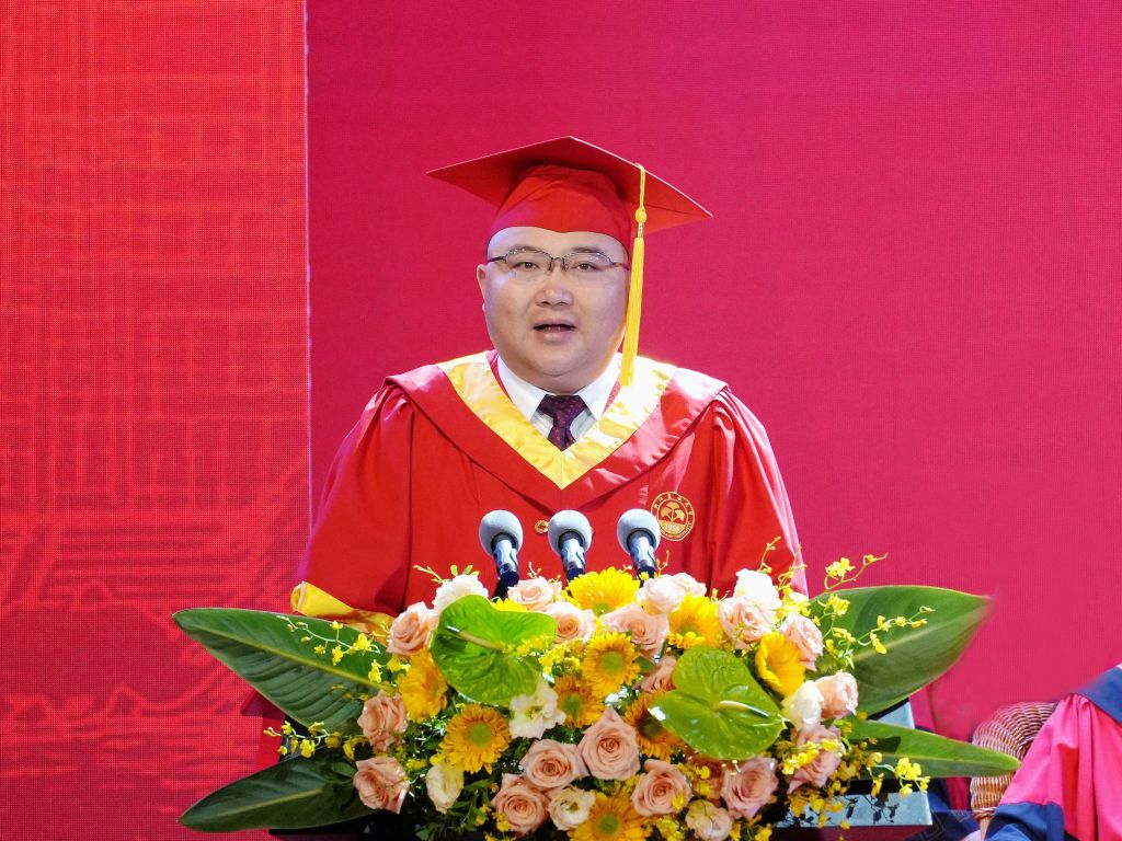 朱斌以《矢志創新  擁抱未來》為題致辭。他和畢業生們一起回憶了許多值得銘記的歷史時刻,希望校園里的美好時光能夠成為大家珍藏在心的回憶,成為大家未來砥礪前行的力量。朱斌向廣大畢業生提出三點期望:希望同學們志存高遠、行而不輟,在追尋人生價值中擁抱未來,要敢夢想、敢嘗試,不畏懼、不拖延,以踏實的步伐、創造的眼光,衡量人生價值,實現人生理想;希望同學們迎接挑戰、繼往開來,在引領時代變革中擁抱未來,要以開放的心態、前瞻性的眼光去擁抱變化,持續汲取新知識,掌握新技能,培養新思維,敢于質疑、善于理解、勇于成為,成為時代的領跑者;希望同學們超越小我、挺膺擔當,在投身強國建設中擁抱未來,要以青春之名、赴時代之約,在推進強國建設、民族復興偉業中展現青春作為,彰顯青春風采,貢獻青春力量,奮力書寫為中國式現代化挺膺擔當的青春篇章。