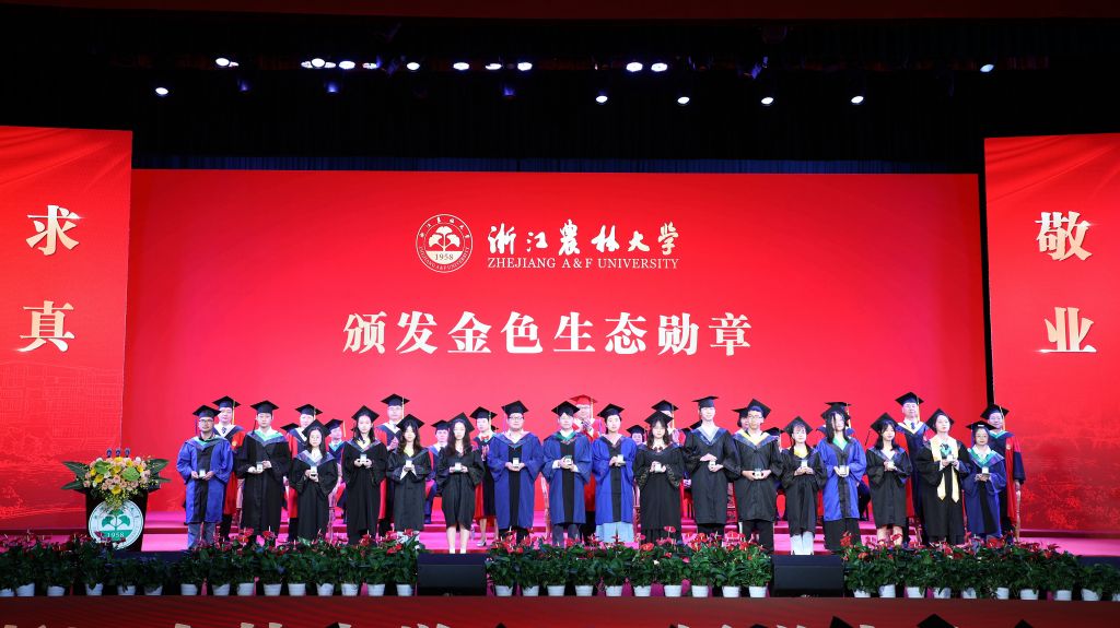 學校堅持生態特色和農林底色,激勵學生自覺踐行生態文明,為鞏固和呈現“生態育人 育生態人”工程的成效,會議為2024屆畢業生金色生態勛章獲得者代表頒發了生態勛章。