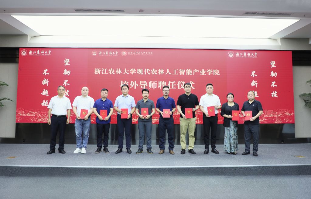 儀式上,舉行了省級浙江農林大學現代農林人工智能產業學院校外導師聘任儀式。胡祖吉為產業學院校外導師代表頒發聘書與校徽。