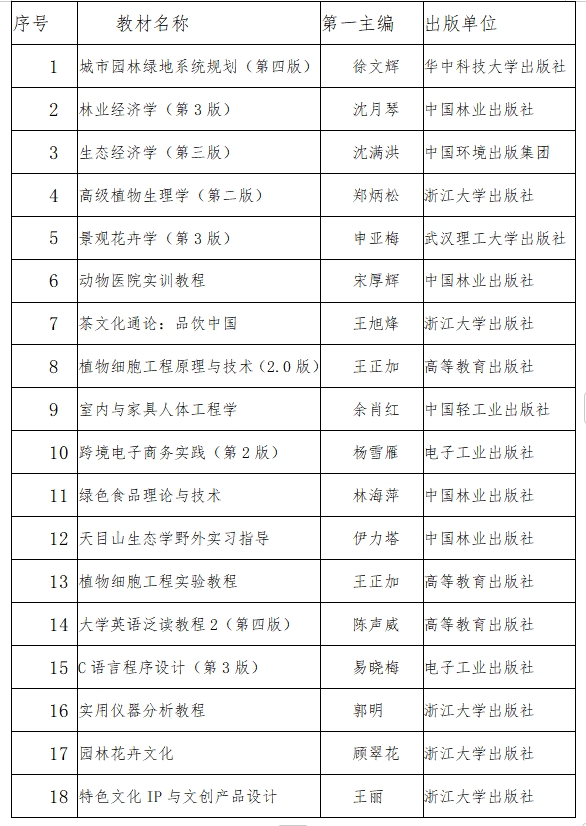 近日,浙江省教育廳公布了浙江省“十四五”普通高等教育本科規(guī)劃教材目錄。我校《城市園林綠地系統(tǒng)規(guī)劃(第四版)》等18部教材入選浙江省“十四五”普通高等教育本科規(guī)劃教材,其中《城市園林綠地系統(tǒng)規(guī)劃(第四版)》等5部教材被推薦申報(bào)“十四五”普通高等教育本科國家級規(guī)劃教材。