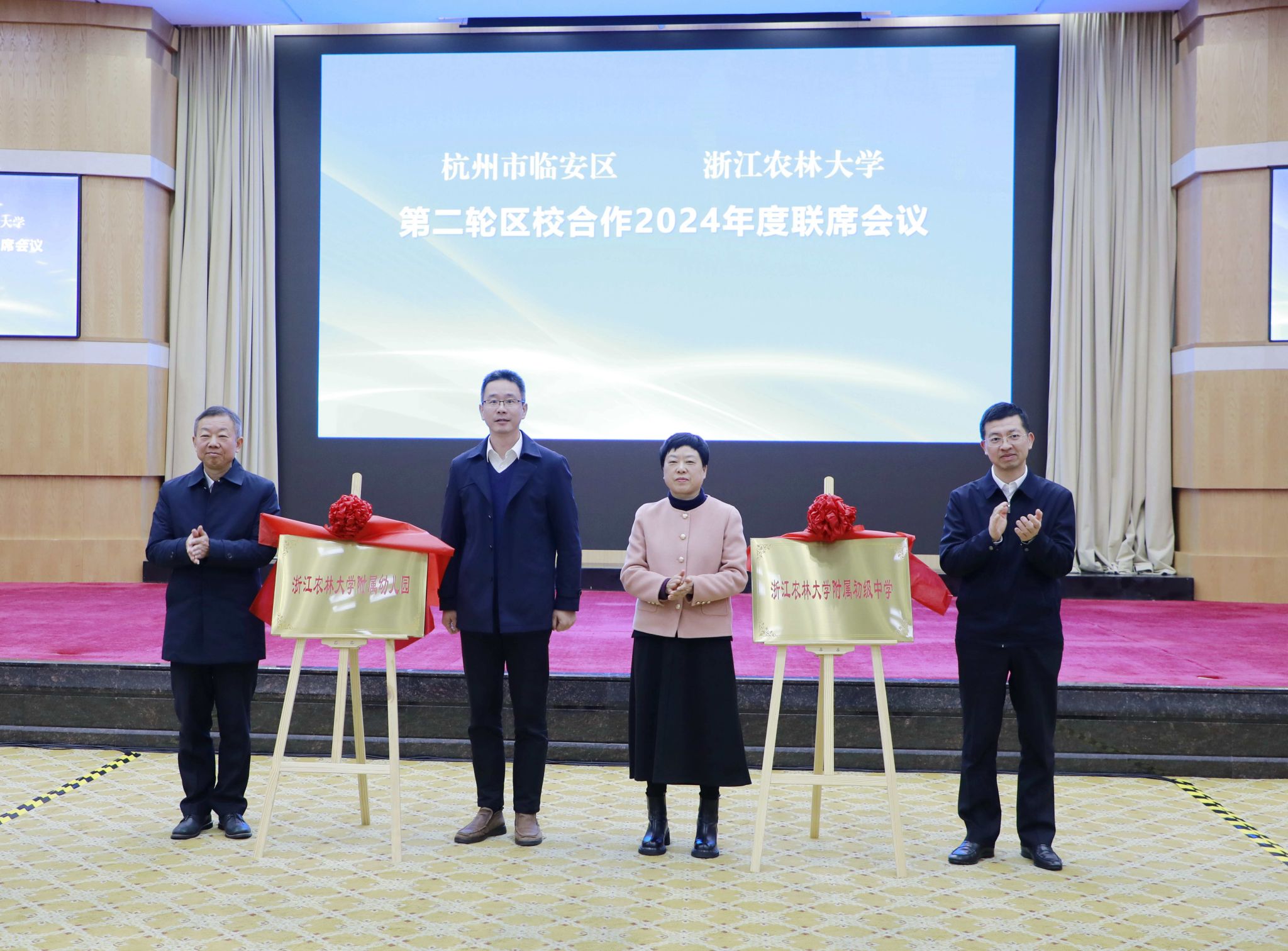 施美紅和唐鋒為浙江農林大學附屬初中揭牌,吳家勝和張凱為浙江農林大學附屬幼兒園揭牌。