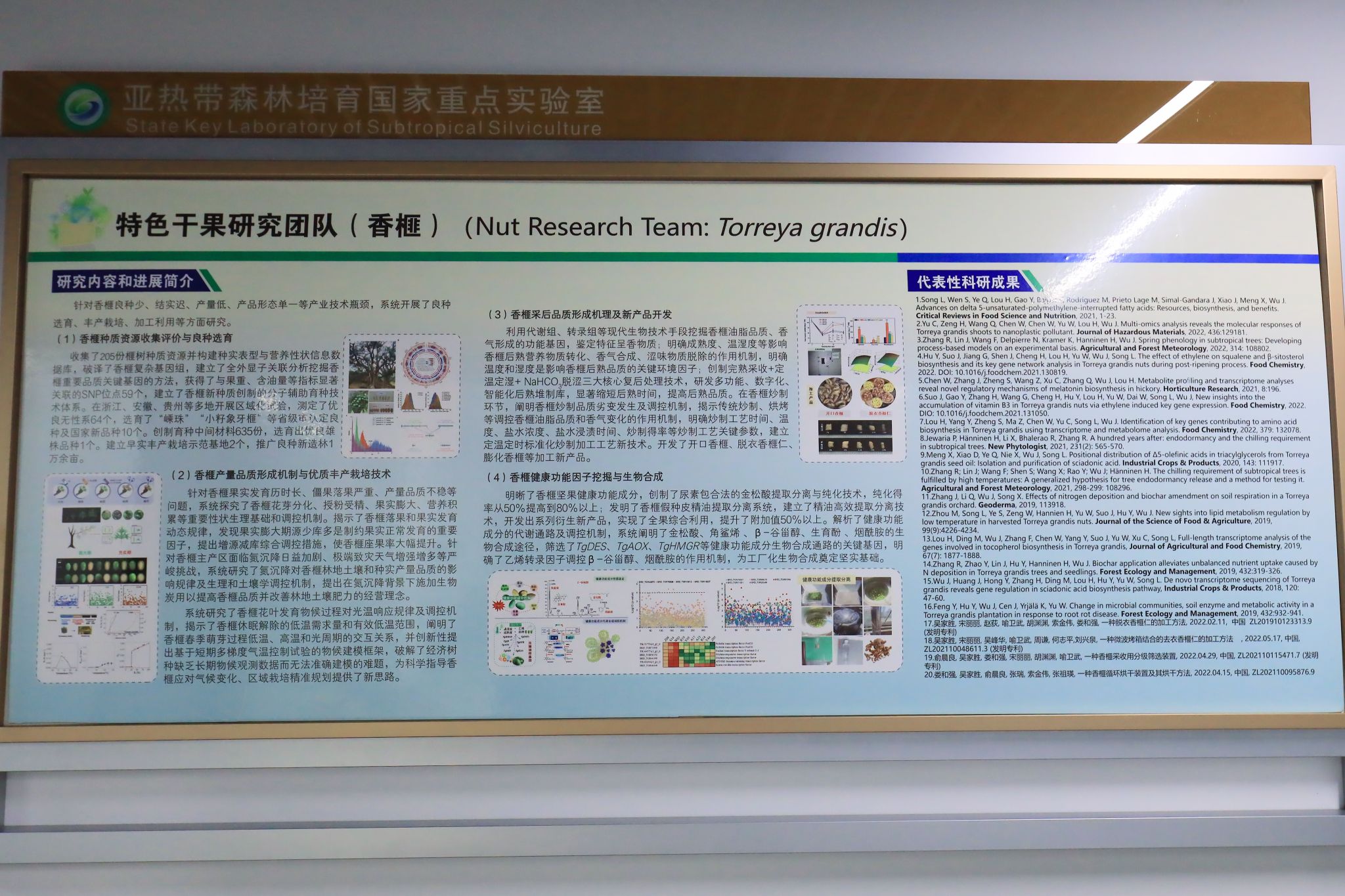 團隊先后承擔國家重點研發計劃項目、國家行業公益性項目、國家自然科學基金、國家農業科技成果轉化資金、浙江省自然科學基金重點項目等國家級及省部級項目級重大科研項目100余項;獲國家科技進步二等獎2項,浙江省科技進步一等獎、二等獎等省部級獎項10余項。發表論文300余篇,其中SCI論文100余篇,包括《Nature Communications》《New Phytologist》《Plant Physiology》《Journal of Advanced Research》等;出版《中國香榧》《浙江省特色干果香榧整形修剪技術手冊》等專著,編制了《香榧育苗技術規程》《香榧籽質量要求》《香榧整形修剪技術手冊》等標準。授權香榧新品種10個、發明專利20余件。研究團隊獲國家林草局“南方特色干果產業科技創新團隊”,在推動香榧理論創新、科技進步和產業發展方面取得顯著成果,在香榧提質增效方面形成特色優勢,并產生了重大的國內外影響。