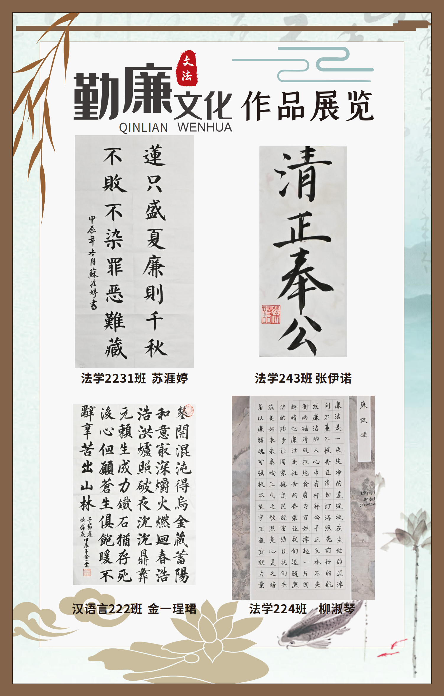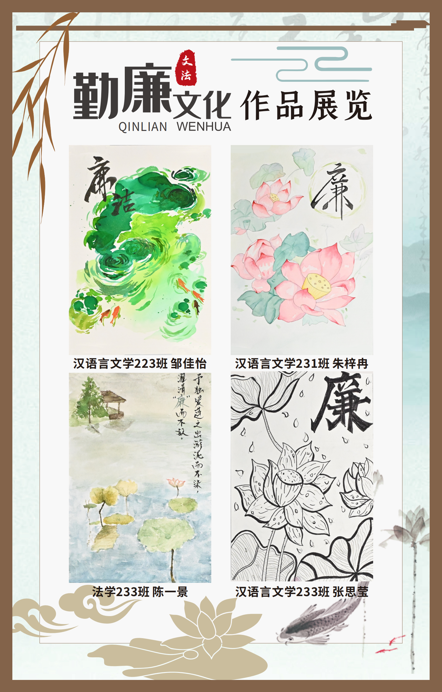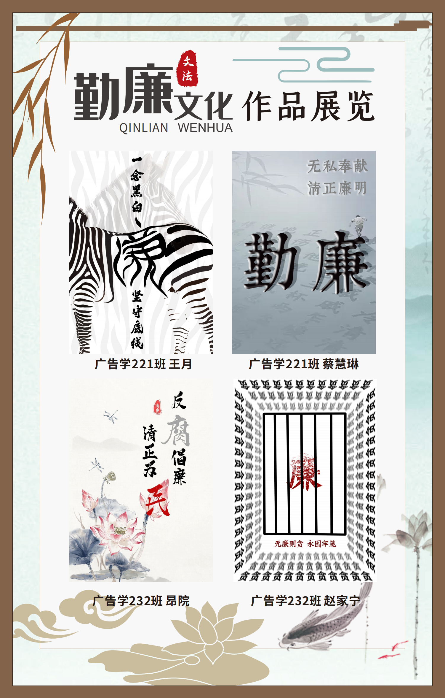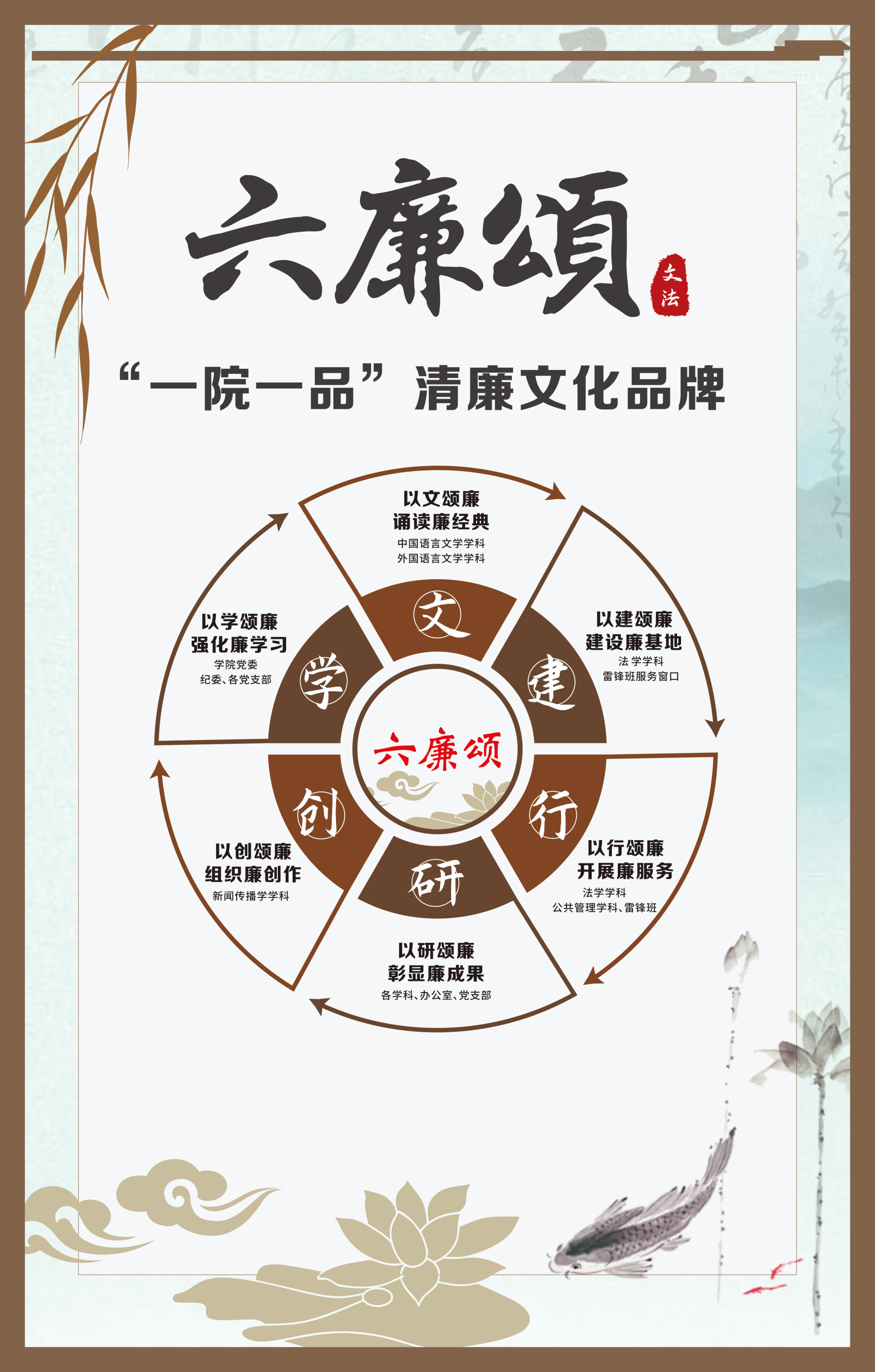 文法學(xué)院“步步生廉”文化走廊,植根于“六廉頌”清廉文化品牌,依托學(xué)院勤廉文化月活動,以師生清廉主題作品為媒介,系統(tǒng)呈現(xiàn)文法學(xué)院師生“知廉、守廉、促廉、倡廉”的實踐自覺,全景展現(xiàn)將新時代廉潔文化建設(shè)融入“立德樹人”根本任務(wù)的生動范例。
