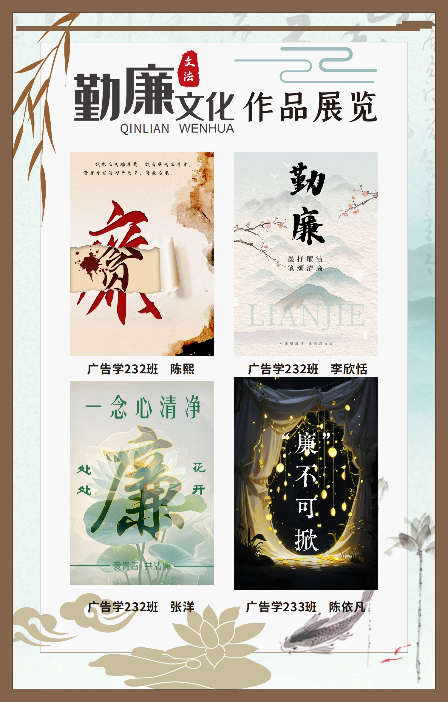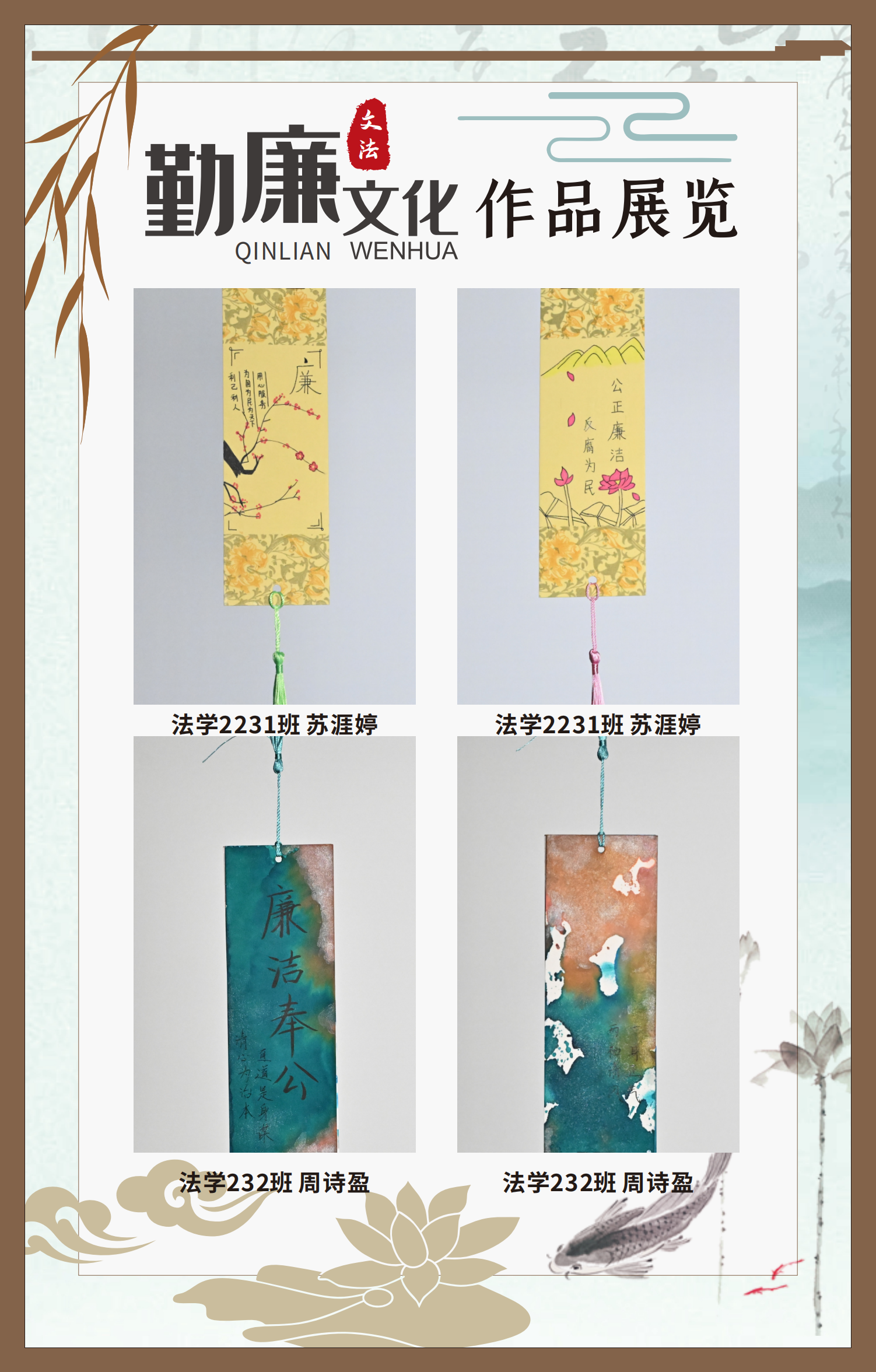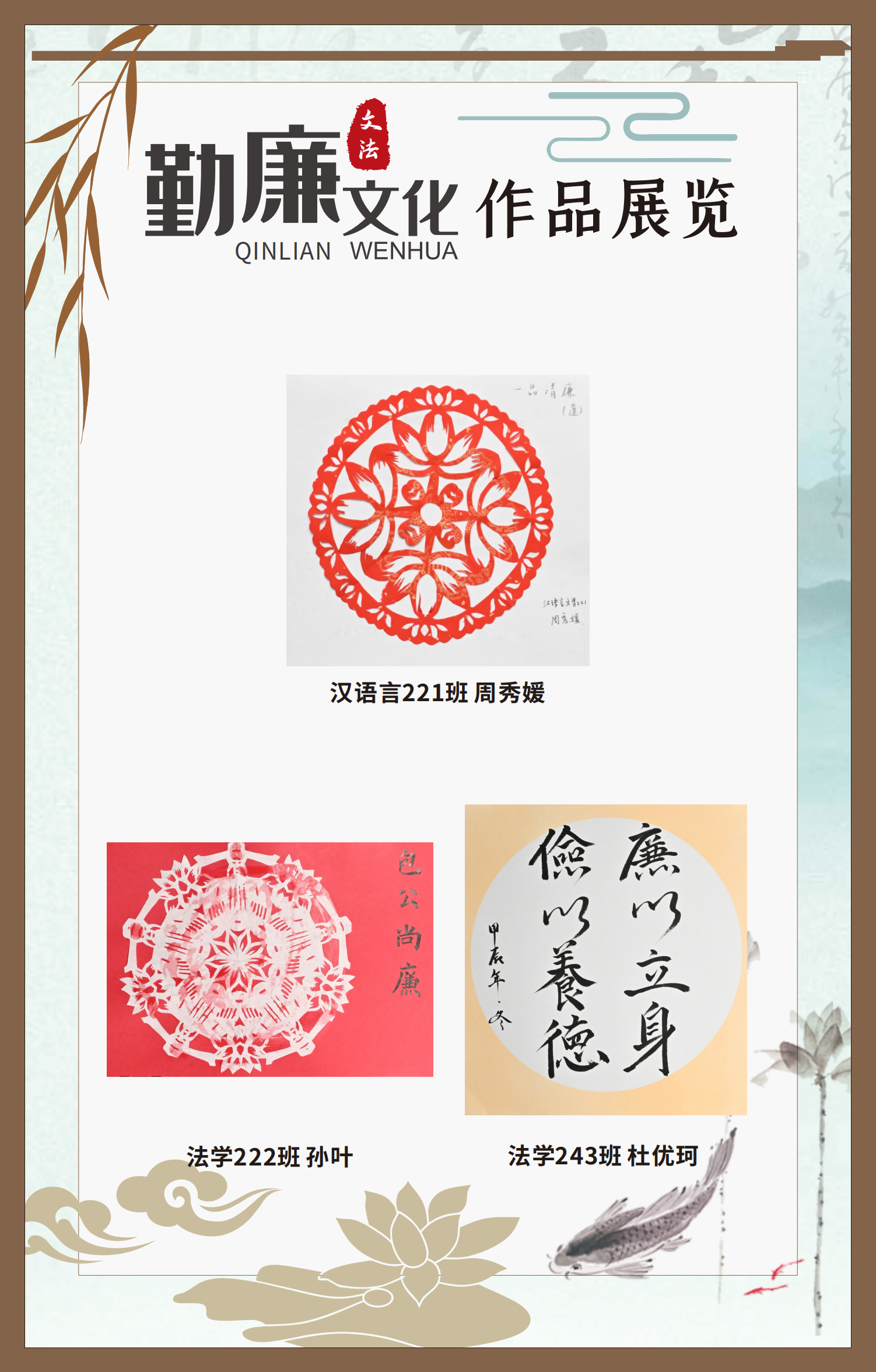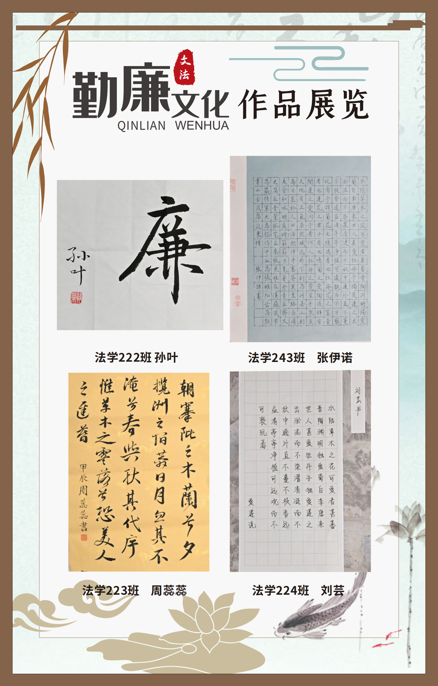 文法學(xué)院“步步生廉”文化走廊,植根于“六廉頌”清廉文化品牌,依托學(xué)院勤廉文化月活動,以師生清廉主題作品為媒介,系統(tǒng)呈現(xiàn)文法學(xué)院師生“知廉、守廉、促廉、倡廉”的實踐自覺,全景展現(xiàn)將新時代廉潔文化建設(shè)融入“立德樹人”根本任務(wù)的生動范例。