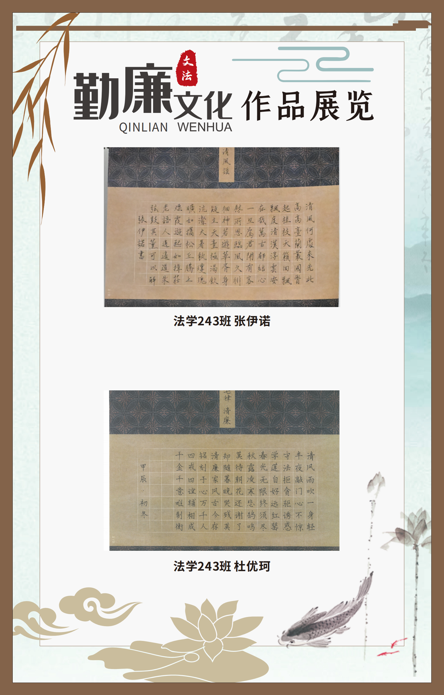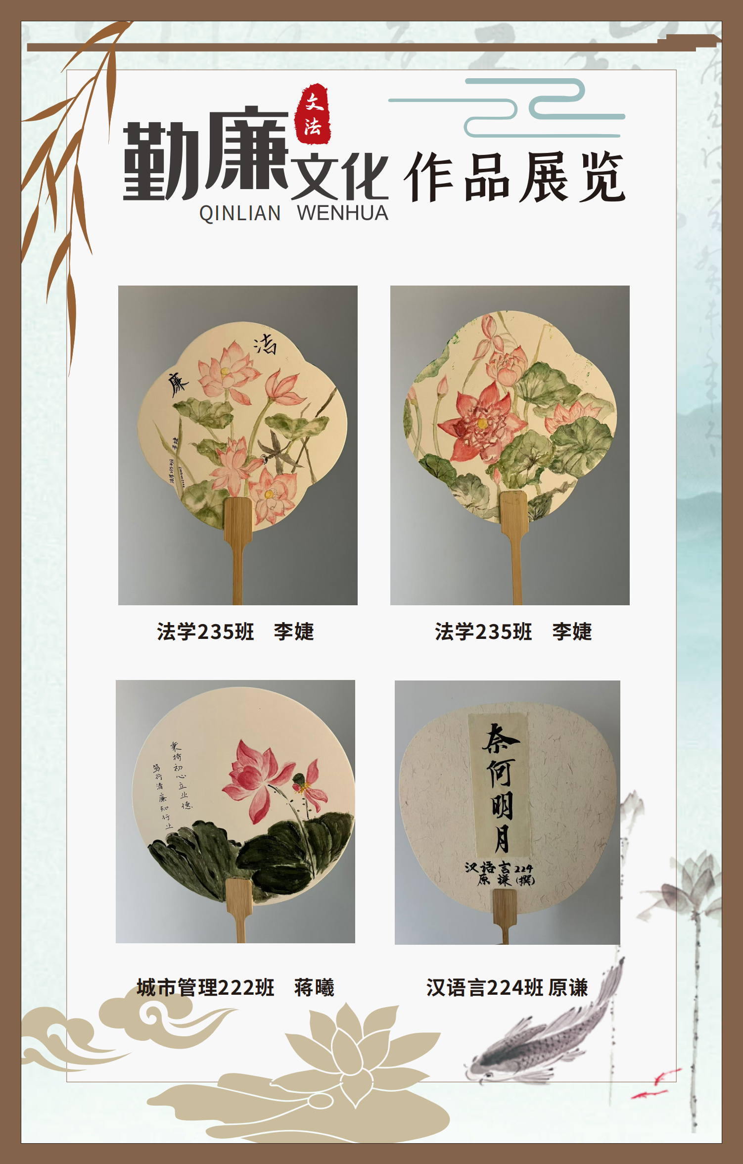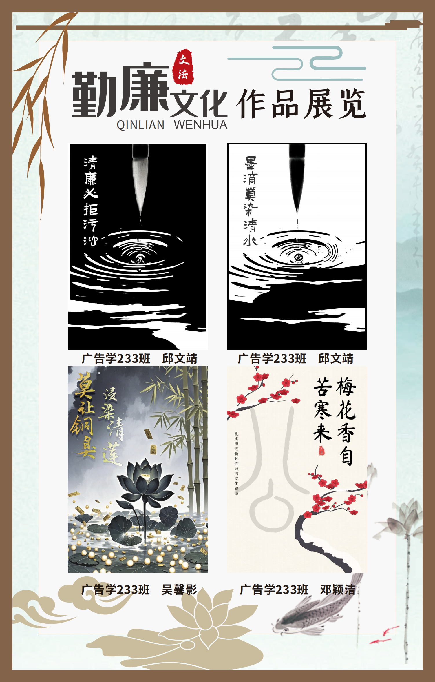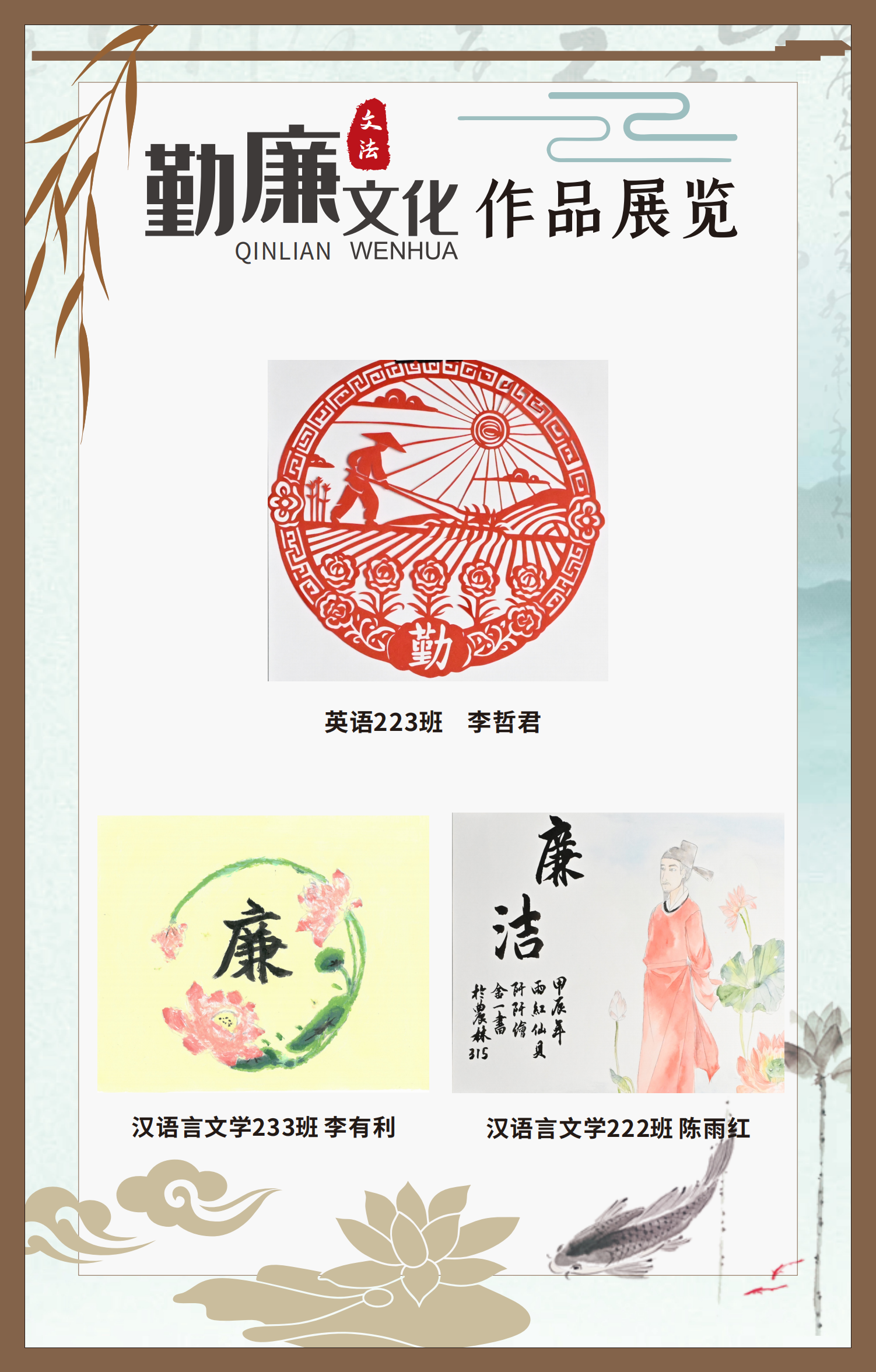 文法學(xué)院“步步生廉”文化走廊,植根于“六廉頌”清廉文化品牌,依托學(xué)院勤廉文化月活動,以師生清廉主題作品為媒介,系統(tǒng)呈現(xiàn)文法學(xué)院師生“知廉、守廉、促廉、倡廉”的實踐自覺,全景展現(xiàn)將新時代廉潔文化建設(shè)融入“立德樹人”根本任務(wù)的生動范例。