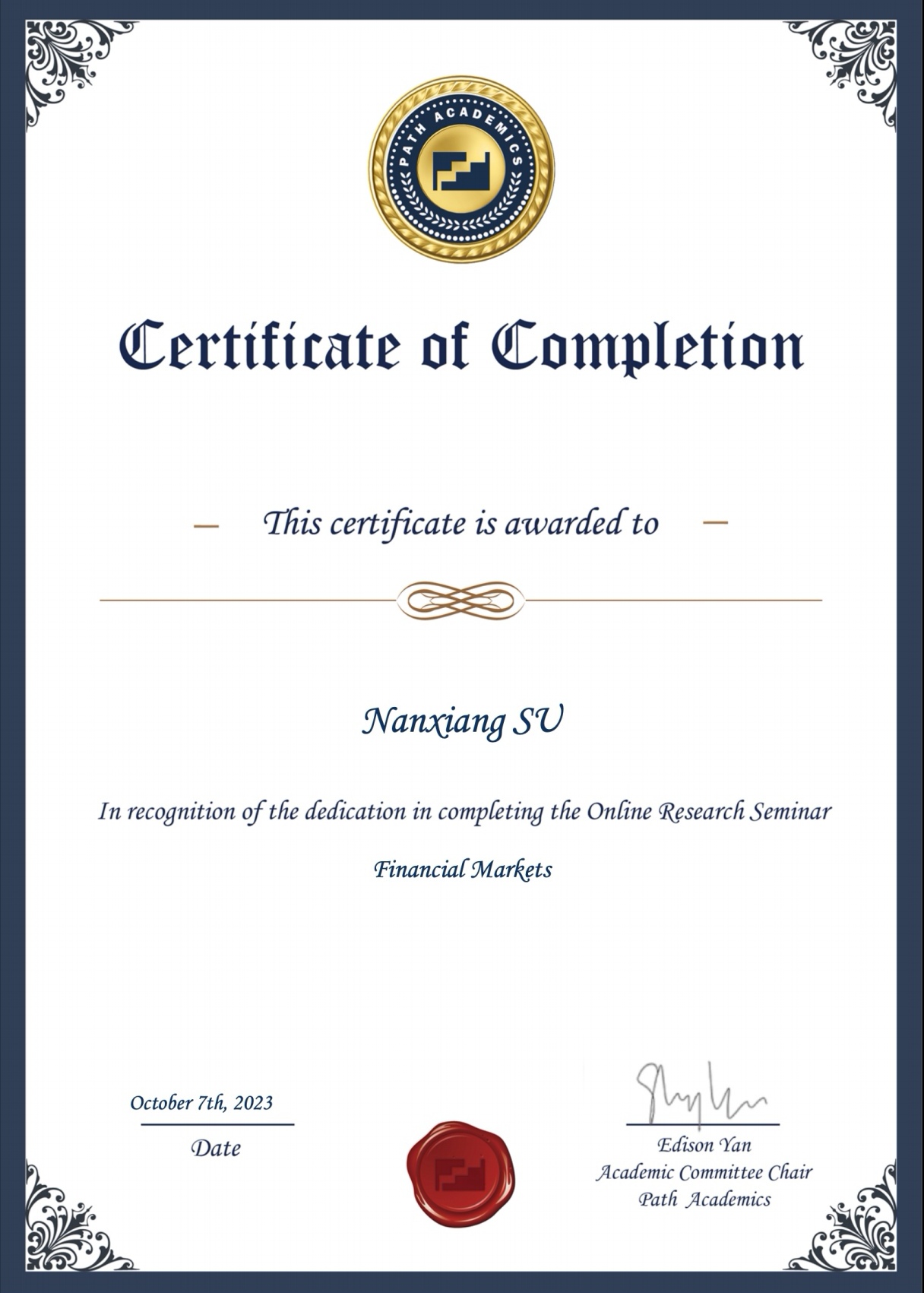 蘇楠翔善于將瑣碎的時間合理利用,爭分奪秒地朝著目標前進。在大學前兩年,他著手準備CFA和FRM證書的學習和考試,并在大三上學期和下學期分別取得了雅思考試7.0與GRE美國研究生考試326分的優秀成績。同時,蘇楠翔還以專業第一的優異成績獲得了一等獎學金、省政府獎學金以及校級“三好學生”的稱號。