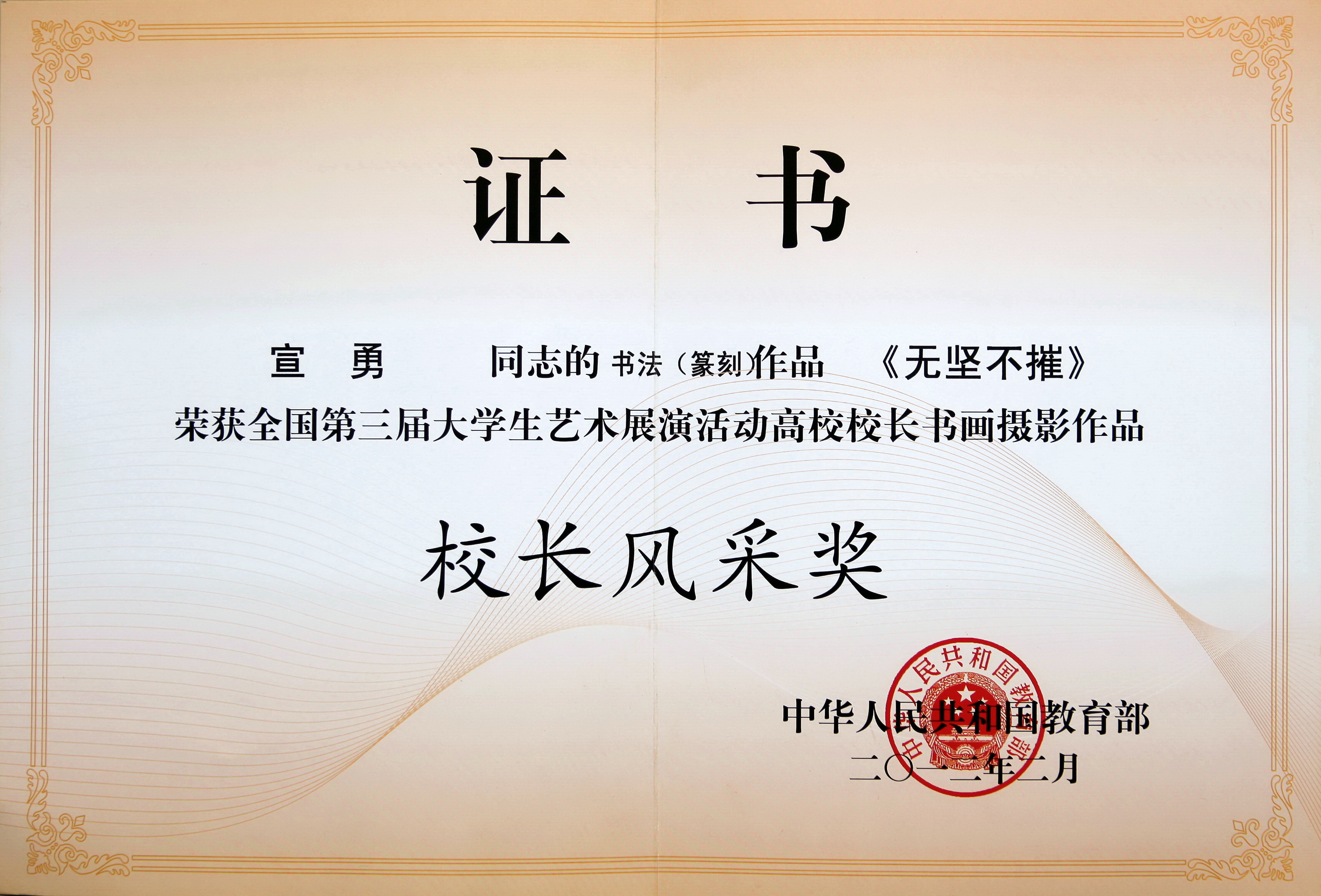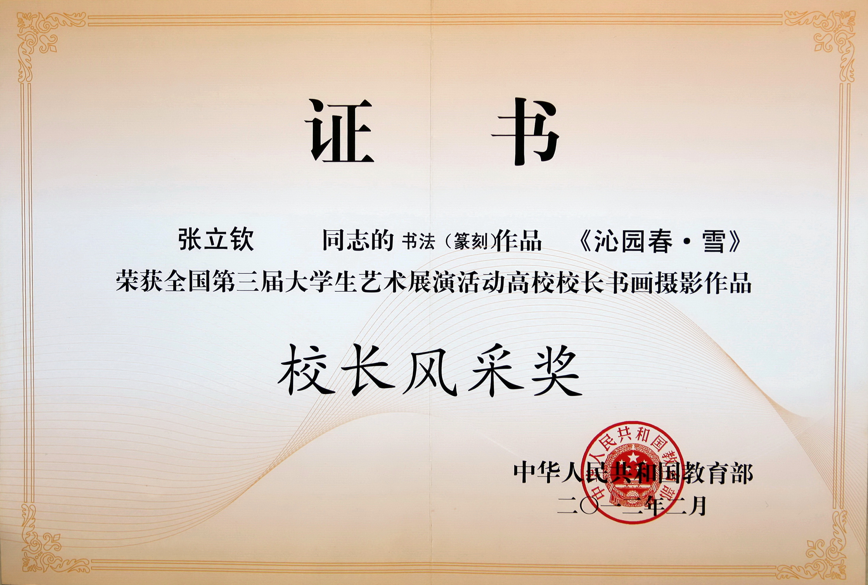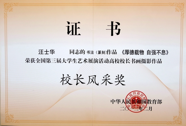 日前,由教育部主辦的全國第三屆大學生藝術展演活動勝利閉幕。在本次大藝展高校校長書畫攝影作品展上,我校黨委書記宣勇教授的書法作品《無堅不摧》,黨委委員、副校長張立欽教授的書法作品《沁園春·雪》,校黨委委員、工會主席汪士華教授的書法作品《厚德載物 自強不息》均榮獲校長風采獎。