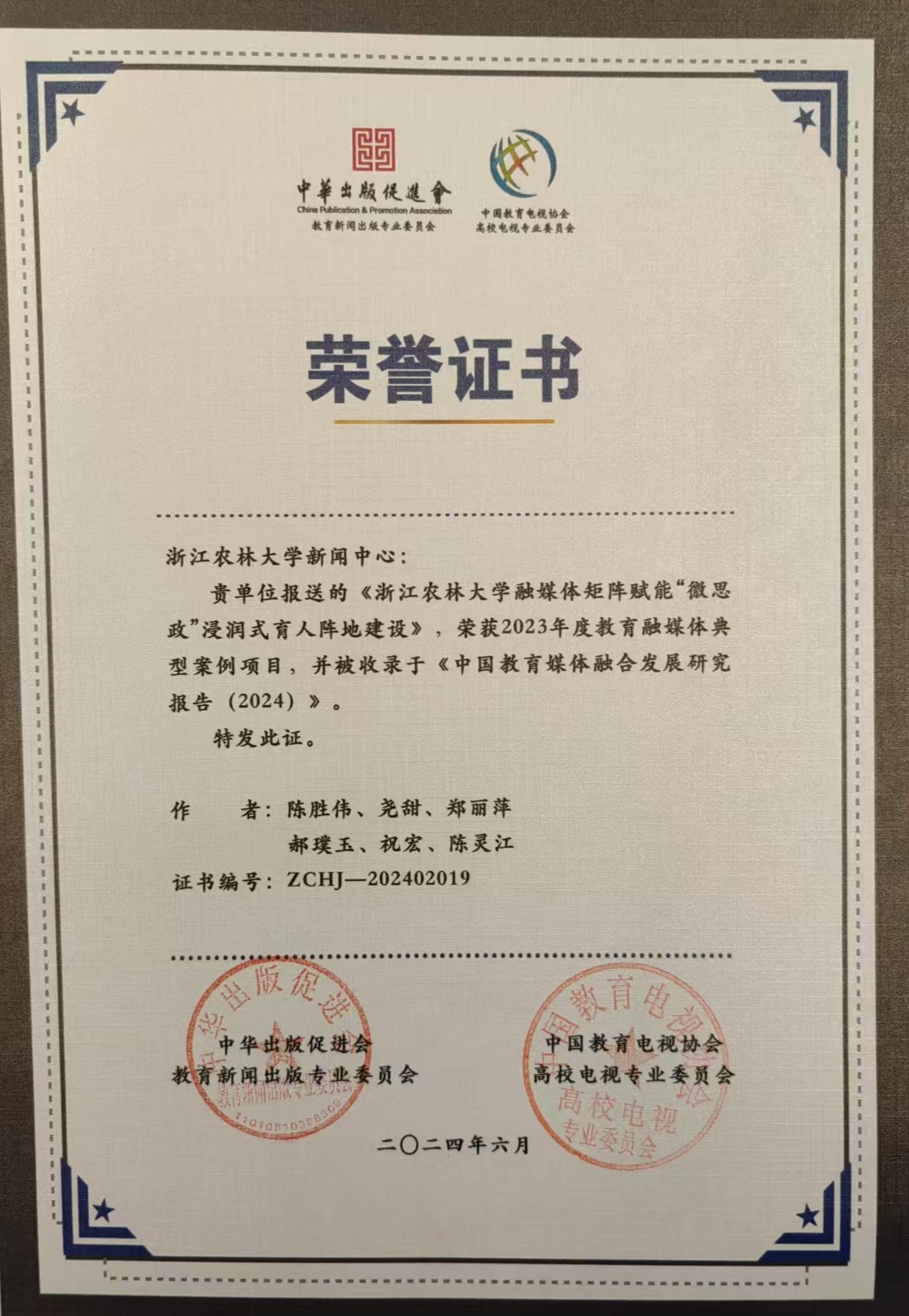 12月4日,中華出版促進(jìn)會(huì)教育新聞出版專業(yè)委員會(huì)2024年年會(huì)在北京舉行。由我校新聞中心報(bào)送的《浙江農(nóng)林大學(xué)融媒體矩陣賦能“微思政”浸潤(rùn)式育人陣地建設(shè)》榮獲2023年度教育融媒體典型案例項(xiàng)目,并被收錄于《中國(guó)教育媒體融合發(fā)展研究報(bào)告(2024)》。新聞中心老師堯甜榮獲2024年度教育新聞出版業(yè)榜樣編輯。