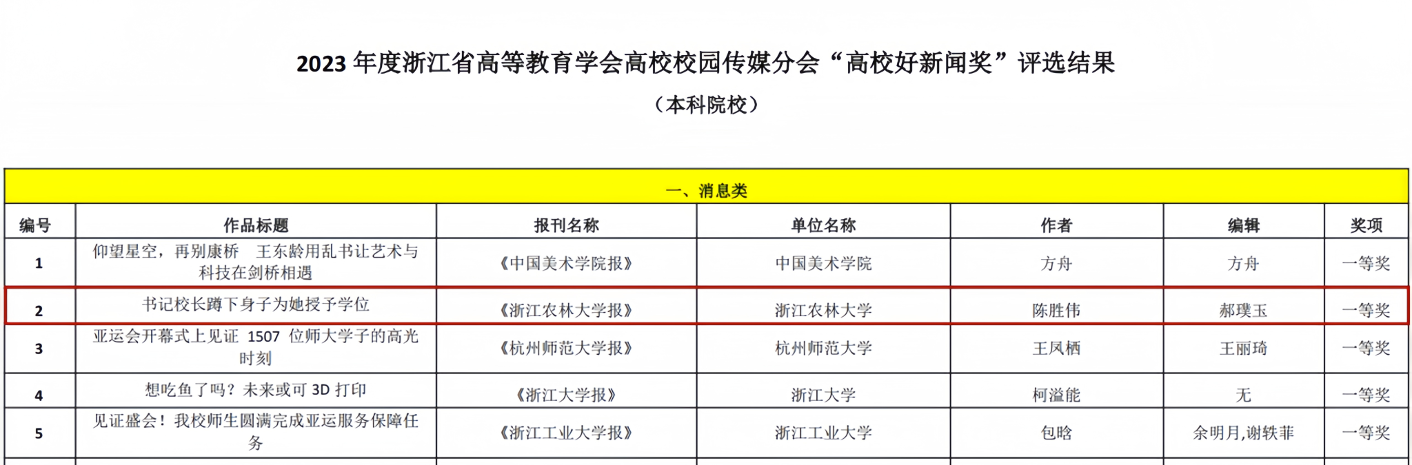2023年度,我校共有四件新聞作品獲獎(jiǎng)。其中《書記校長(zhǎng)蹲下身子為她授予學(xué)位》獲消息類一等獎(jiǎng),《浙江農(nóng)林大學(xué)報(bào)》2023年10月31日第697期第02.03版、2023年12月31日第699期第04版、2023年12月31日第699期第03版分別獲版面類三等獎(jiǎng)。