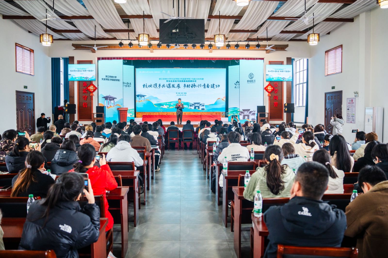 建德市委組織部副部長李佳、農業農村局副局長吳玲燕、航頭鎮黨委書記鄭雄、航川村黨委書記寧德良、家味航川文旅公司董事長勞立江,我校文法學院黨委副書記(主持工作)徐達及相關學科負責人、村官學院百余名學生出席簽約儀式。
