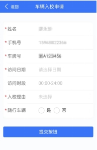 4.車(chē)輛預(yù)約:點(diǎn)擊‘車(chē)輛入校申請(qǐng)’,跳轉(zhuǎn)車(chē)輛入校申請(qǐng)頁(yè)面。按照提示填入信息,提交(首次進(jìn)行車(chē)輛預(yù)約,需要填寫(xiě)個(gè)人信息再進(jìn)行預(yù)約)。提交跳轉(zhuǎn)“申請(qǐng)記錄”頁(yè),查看自己的申請(qǐng)記錄。