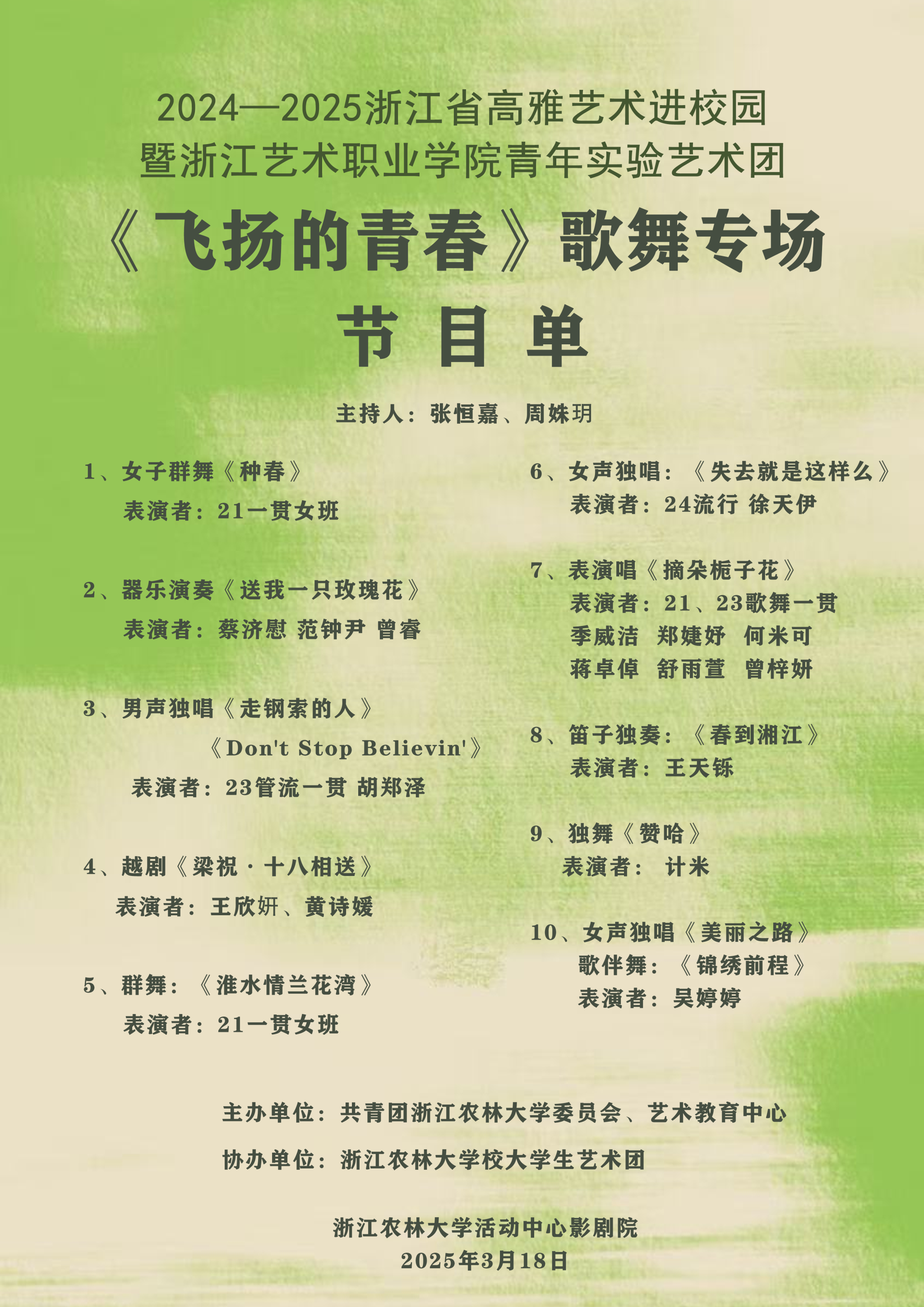 關(guān)于高雅藝術(shù)進(jìn)校園——浙江藝術(shù)職業(yè)學(xué)院青年實(shí)驗(yàn)藝術(shù)團(tuán)歌舞專場(chǎng)《飛揚(yáng)的青春》演出公告