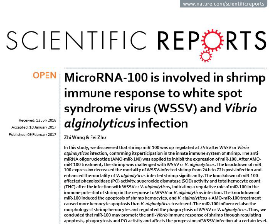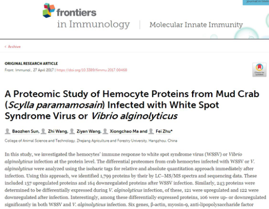近期,動物科技學院朱斐實驗室在國際學術期刊《Frontiers in Immunology》、《Scientific Reports》雜志上分別發表題為“A proteomic study of hemocyte proteins from mud crab (Scylla paramamosain) infected with white spot syndrome virus (WSSV) orVibrio alginolyticus”和“MicroRNA-100 is involved in shrimp immune response to white spot syndrome virus (WSSV) andVibrio alginolyticusinfection”的文章,朱斐副研究員為論文通訊作者,碩士研究生孫保貞、王徵分別為文章的第一作者。