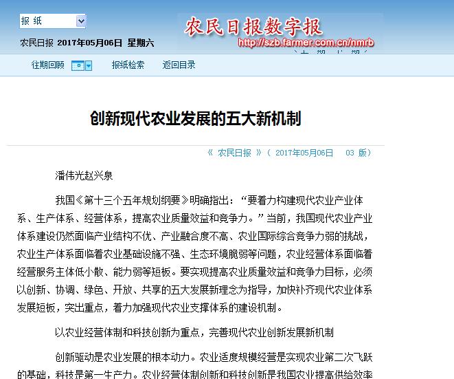 5月6日,《農(nóng)民日報(bào)》以大篇幅刊登我校中國農(nóng)民發(fā)展研究中心常務(wù)副主任趙興泉、專職副主任潘偉光的理論文章《創(chuàng)新現(xiàn)代農(nóng)業(yè)發(fā)展的五大新機(jī)制》。