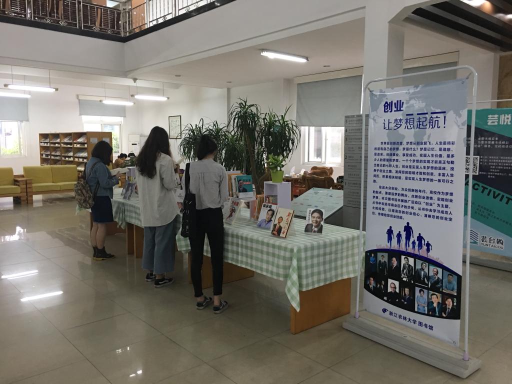 5月12日,圖書館繼“人物傳記”主題書展后又一次推出以“創業”為主題的閱讀書展。本次書展共展出創業相關書籍369冊。通過閱讀,青年學生可從書中追尋商業巨子的步伐,學習成功人士的經驗,如馬云、王健林等創業佼佼者們的成功經驗,站在他們的肩膀上把創業之路看得更遠更清楚,思考如何提高個人綜合素質和創新創業能力,堅定創新創業的信念與決心。