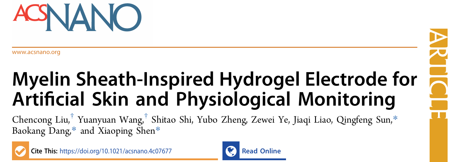 9月27日,林業工程學科生物質仿生智能研究團隊在納米材料領域國際期刊《ACS Nano》(中科院1區Top,IF=15.8)在線發表題為《用于人造皮膚以及生理信號監測的髓鞘啟發水凝膠電極》(Myelin sheath-inspired hydrogel electrode for artificial skin and physiological monitoring)的研究論文。該團隊本科生柳晨聰為本文第一作者,浙江農林大學化學與材料工程學院為該論文第一單位和通訊作者單位。