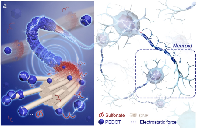 在含髓鞘的神經纖維中,每兩個施萬細胞之間的無髓鞘軸索是裸露的,構成郎飛結,興奮以跳躍的方式在相鄰的兩個結之間形成局部電流,大大加快了信號傳導速度。由于電壓依賴性鈉(Nav)通道的節點簇的存在和髓鞘的電容特性,朗飛結的存在促進動作電位的快速、定向躍遷傳播。受這一現象的啟發,我們設計并合成了一種“反朗飛結”導電納米纖維,將其引入自適應性水凝膠聚電解質基質內部,形成含節段性導電躍遷通路的仿生神經網絡。