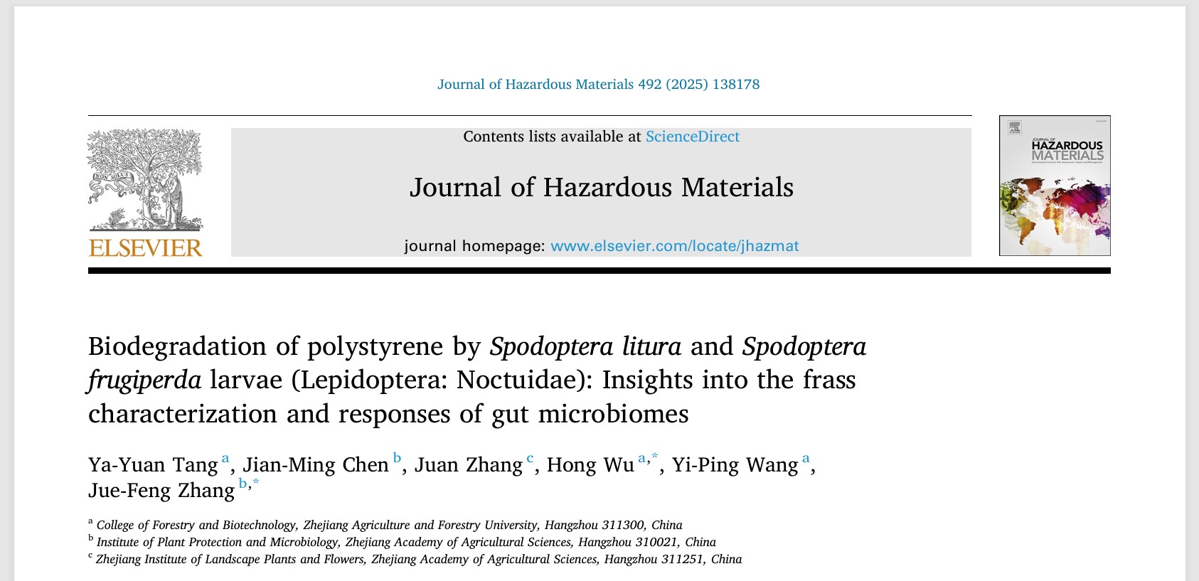 近日,林業與生物技術學院博士研究生唐婭媛在《Journal of Hazardous Materials》(危險材料雜志)(中科院環境科學與生態學1區Top, IF 12.2 )發表題為“Biodegradation of polystyrene bySpodoptera lituraandSpodoptera frugiperdalarvae (Lepidoptera: Noctuidae): Insights into the frass characterization and responses of gut microbiomes”(《斜紋夜蛾與草地貪夜蛾幼蟲(鱗翅目:夜蛾科)對聚苯乙烯的生物降解:排泄物表征與腸道微生物組響應機制的研究》)的研究論文。林業與生物技術學院吳鴻教授及浙江省農業科學院植物與微生物研究所張玨鋒副研究員為本文的共同通訊作者。浙江農林大學林業與生物技術學院為該論文第一單位和通訊作者單位。林業與生物技術學院王義平教授、浙江省農業科學院植物與微生物研究所陳建明研究員以及浙江省園林植物與花卉研究所張娟副研究員為共同作者。