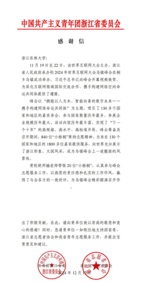 近日,共青團(tuán)浙江省委、浙江省志愿者協(xié)會向我校發(fā)來感謝信,向浙江農(nóng)林大學(xué)支持2024年世界互聯(lián)網(wǎng)大會烏鎮(zhèn)峰會工作表示衷心感謝。